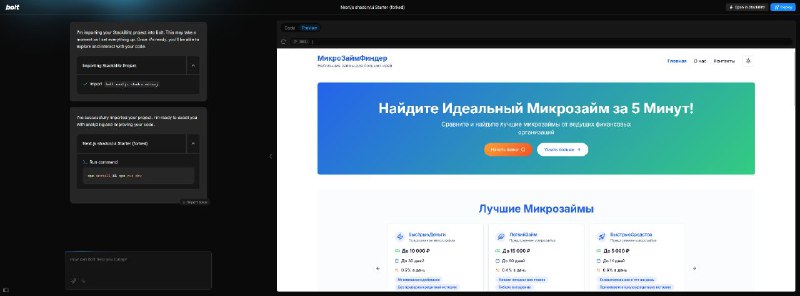 Касательно микрозаймов и в целом проектов. Друг посоветовал софт, который генерирует, как минимум, клиентскую часть сайта за минуты. И не просто генерирует, а делает хороший, поддерживаемый код и дизайн. Это изменение игры. Так как я разрабатывал свой лендинг сам, мне уже не хочется его бросать. Поэтому просто брал куски кода, адаптировал и забирал себе, что очень ускорило разработку. Уже подписался на платный тариф: всего 900 рублей в месяц за "фронтенд за 10 минут", стоит того сверх меры. Скриншот, как это выглядит, ниже.