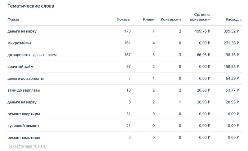 Тематические слова показаны на последнем изображении. Например, я уже убрал из выборки "рассрочка iphone": для этого запроса было много просмотров и посещений, тысячи, но при этом 0.1% целевых действий. Яндекс всё продолжает заявлять, что кампания ещё "обучается" и надо подождать, будет лучше.