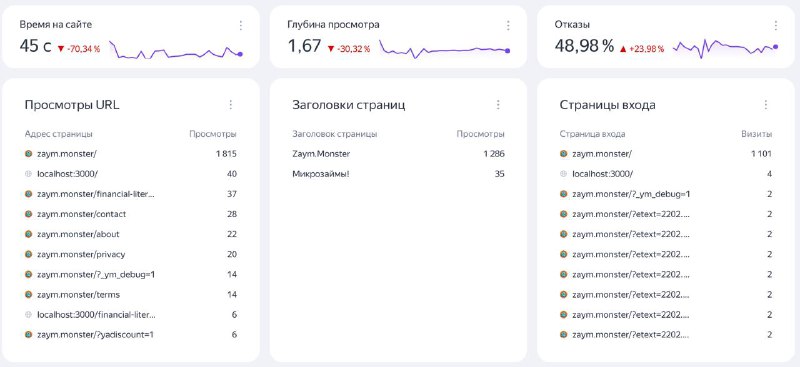 Из интересного, по некоторым запросам, например, по названию организации-займа, мой сайт появился на первых страницах поисковых систем, а иногда даже выше сайта организации. Поэтому со мной связались представители партнёрской программы и попросили добавить минус-слова исключения, чтобы сайт по ним не находился. В целом, справедливо. Но вот добавить уже вызвало трудности: минус-слов довольно много, а сайт Яндекса не вмещает столько и не показывает ошибку. Чтобы понять, что столько слов нельзя, мне пришлось отслеживать консоль разработчика. А также он сильно зависает: для того, чтобы добавить хотя бы текущие нарушения, ушло несколько часов попыток и общения с поддержкой.
